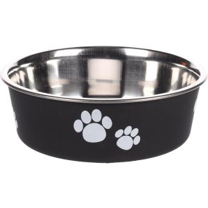 Praktická miska s nerezovou vložkou, ktorá je skrytá krásnym plastovým opláštením v čiernej farbe s labkami.