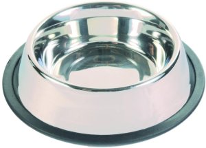 Praktická nerezová miska s gumovým okrajom, ktorá zabráni sklzu po podlahe.