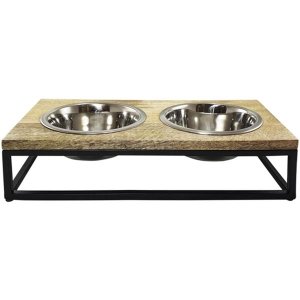 Elegantný stojan z mangového dreva v kombinácii s kovom, 2 nerezové misky.