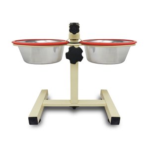 Výškovo nastaviteľný stojan v bielej farbe s dvoma nerezovými lavorkami uľahčí prístup k potrave.