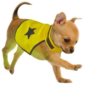 Najmenšia veľkosť signálne žltej fluorescenčnej vesty s reflexnými prvkami v podobe pruhu a pacičky zvýši viditeľnosť vášho psieho miláčika v tme.