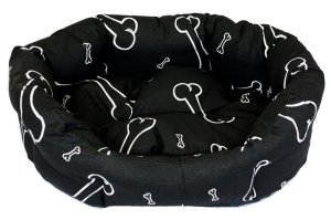 Pohodlný, kvalitný pelech vyrobený z bavlnenej látky potlačenej kosťami a kockami, vyplnený dutým vláknom.