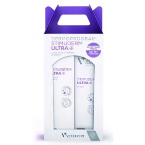 Stimuderm Ultra Dermoprogram Duobox Long Hair je dvojstupňová starostlivosť pre dlhosrsté psy, ktorá sa skladá zo šampónu a séra.
