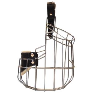 Kovový náhubok s koženými remienkami na zapínanie.