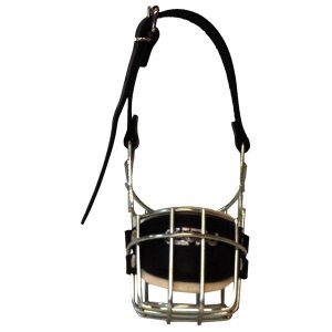 Kovový náhubok s upínacími remienkami z barexu.