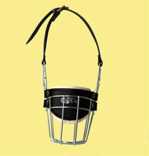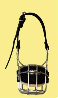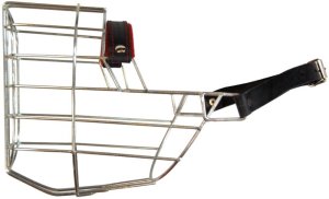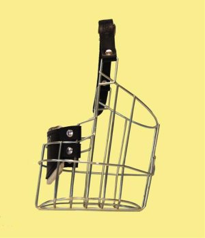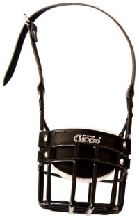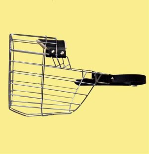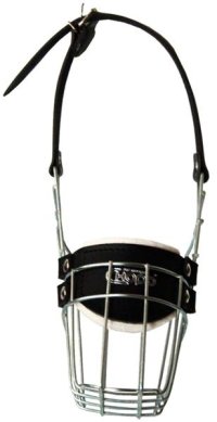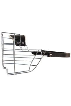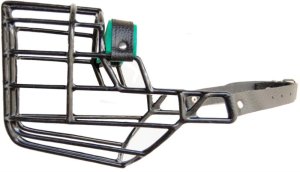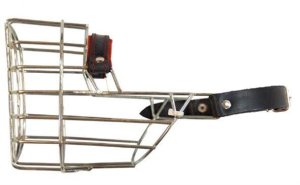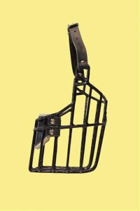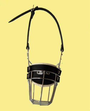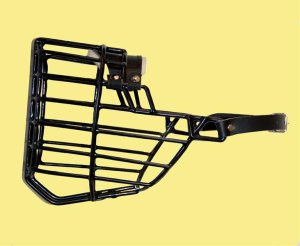 Kovový čierny náhubok s koženými remienkami na zapínanie.