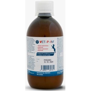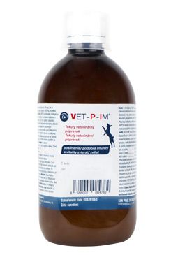 Tekutý veterinárny prípravok na posilnenie imunitného systému a vitality zvierat. Zloženie: 1 ml obsahuje: BAP-8 (štandardizovaný izolát pleuran) 10 mg Pomocné látky: fruktóza 100 mg, kyselina citrónová 2 mg, sorban draselný 0,5 mg Cieľový druh zvierat: psy, mačky, ovce, kone, ošípané, hovädzí dobytok Charakteristika: BAP-8 je komplex biologicky VET-P-IM získava izoláciou z hlivy ustricovej (Pleurotus ostreatus).