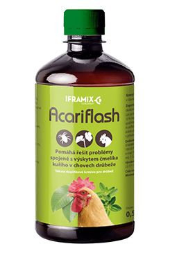 Prípravok proti čmelíkom Acariflash je prírodné tekuté doplnkové krmivo pre hydinu, na báze výťažkov z rastlín, ktoré sú čmelíkom nepríjemné a odpudzujúce.