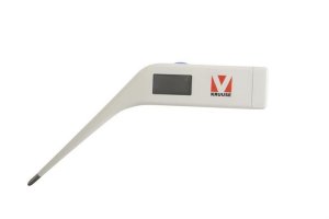 Digitálny teplomer so zahnutou meracou časťou určený na meranie rektálnej teploty u zvierat.
