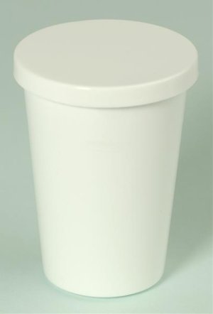 Lekárenský plastový kelímok s viečkom, s objemom 250 ml, vyrobený zo zdravotne nezávadných vstrekovaných plastov, určený najmä pre farmaceutický priemysel.