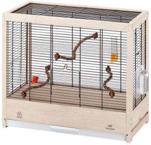Vybavená klietka pre vtáky stredného rozmeru s konštrukciou z masívneho dreva.
