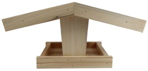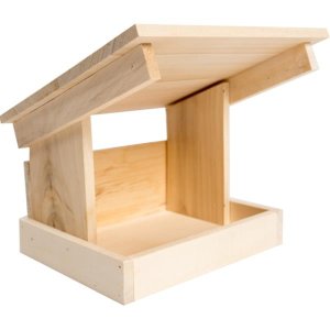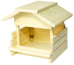 Drevené kŕmidlo pre vtáky. Výška: 19 cm, šírka: 24 cm, hĺbka: 19 cm.
