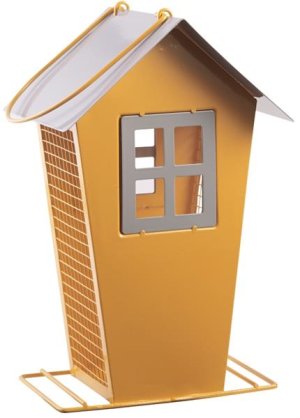Závesné kovové vonkajšie krmítko na orechy v tvare domčeka.