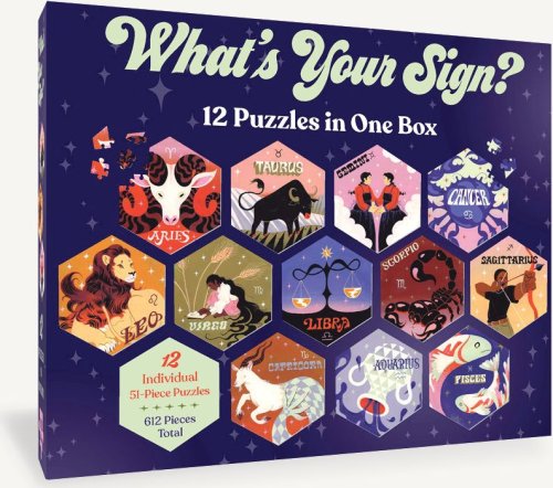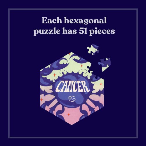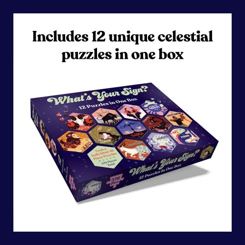 Táto sada 12 puzzle v jednej krabici obsahuje dvanásť rôznych znamení zverokruhu, z ktorých každé je samostatne vyobrazené na nádhernom farebnom šesťhrannom puzzle s 51 dielikmi.