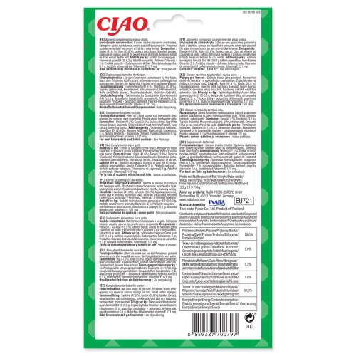 Zloženie: Mäso a výrobky živočíšneho pôvodu (kuracie mäso 41,6%), tuniak (33,8%), tapioka (sušená), sušený vaječný bielok, kazeinát sodný, kurací extrakt, kvasnice a časti kvasníc, extrakt z tuniaka, extrakt zo zeleného čaju.