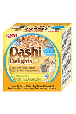 Obľúbené Dashi teraz v tuniakovej receptúre so syrom a bez kuracieho mäsa. Dashi je tradičný japonský rybí vývar z tuniakových vločiek, ktorý je známy svojou výnimočnou, lahodnou chuťou. Zaradenie Dashi do jedálnička vašej mačky môže dodať kŕmenie nový rozmer a urobiť ho výnimočným zážitkom. Nejde len o chuť – dashi môže poskytnúť aj dôležité živiny vrátane vitamínov a minerálov. Dashi má nízky obsah kalórií a tuku, takže je zdravým doplnkom stravy vašej mačky. Je to produkt na báze vývaru, čo znamená, že obsahuje vysoké množstvo vody a tým pomáha udržať zdravie vašej mačky. Dashi sa môže stať chutným a výživným doplnkom stravy vašej mačky, ktorý si vďaka jej neodolateľnej chuti určite zamiluje. Všetky produkty Inaba sú vždy bez obilnín, zbytočných ingrediencií a pochybných prísad a sú vyrobené z pravého morského tuniaka. Hydratačné, výživné a vždy lahodné. Dashi poteší.