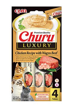 Churu Luxury je nový rad obľúbených Churu maškrty doplnených o LUXUSNÚ ingredienciu. Receptúra kuracie s hovädzím mäsom Wagyu obsahuje takmer 6% tohto mäsa, ktoré dodáva Churu Luxury skutočne luxusnú chuť. Doprajte vašej mačke výnimočnú maškrtu vyrobenú zo zdravých surovín, ktorým môžete dôverovať. Bez obilnín, konzervantov a umelých farbív.