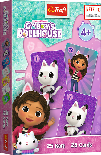 Kto sa zbaví všetkých svojich kariet s rovnakým označením a komu na konci hry zostane v ruke Čierny Peter? Hrou Vás budú sprevádzať postavičky z obľúbeného seriálu Gabby. Karty: 25 kariet - 12 dvojíc označených rovnakou číslovkou + 1 Čierny Peter Rozmer krabičky: 6 x 9 cm Vhodné od 4 rokov