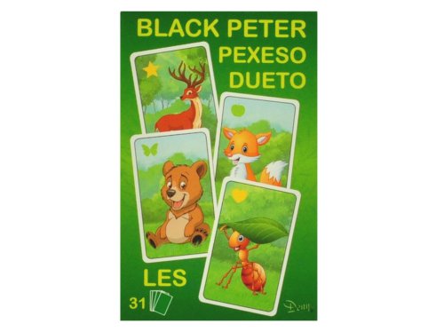 Hra Čierny Peter prináša deťom i dospelým zábavu, poučenie a rozvíja schopnosti a zručnosti detí. Pexeso je hra zameraná na rozvoj koncentácie, pamäte, bystrosti a trpezlivosti. Dueto je kartová hra, ktorej cieľom je zhromaždiť dvojicu k sebe prislúchajúcich kariet. Balenie obsahuje sadu hier 3v1 v dizajne lesa. Určené pre deti vo veku od 3 rokov.