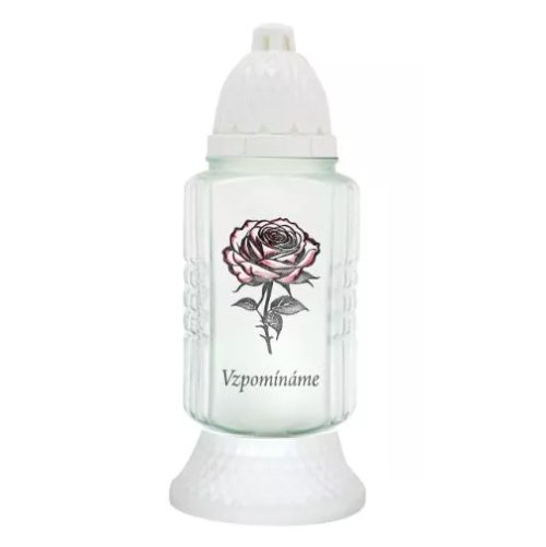 Sklenená cintorínska sviečka s vymeniteľnou parafínovou náplňou 80g, s plastovým spodkom, zaisťujúcim dobrú stabilitu skla a plastovým vrškom, ktorý chráni plameň pred zhasnutím vplyvom vetra a dažďa. Rozmery 8 x 8 a výška 27 cm, možnosť použiť náhradný vklad 100g. Doba horenia do 24 hodín. Vyrobené v EÚ. EAN