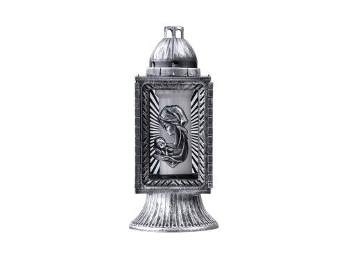 Táto strieborná lampáš s motívom Márie poskytuje 16 hodín horenia a je vhodná pre cintorínske dekorácie. Jej rozmery sú 31 cm.
