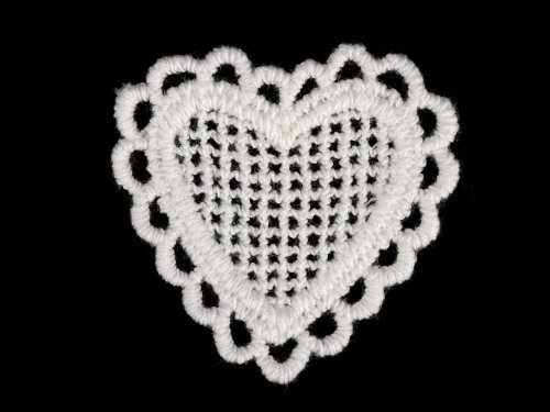 Textilná aplikácia srdiečko má rozmery 45 x 45 mm. Okraje tvoria ozdobné oblúky. Používa sa na zdobenie odevov, bytových doplnkov, na scrapbooking a ďalších dekorácií napr. vlastnej tvorby.