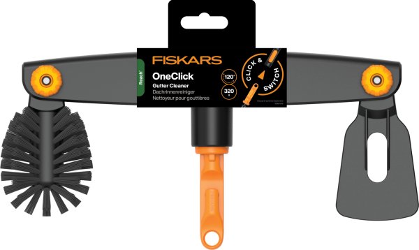 Čistič odkvapov Fiskars OneClick je navrhnutý pre efektívnu údržbu strešných žľabov priamo zo zeme. Kombinuje v sebe škrabku na odstránenie hrubých a usadených nečistôt a zaoblenú kefu na finálne dočistenie. Vďaka nastaviteľnému uhlu pracovnej hlavy a teleskopickej násade OneClick vyčistíte odkvapy rýchlo a bez rizika spojeného s prácou na rebríku.