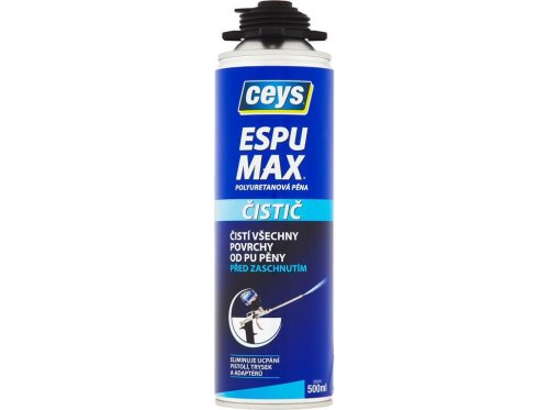 Espumax čistič polyuretánu. Špeciálny čistič určený na odstránenie zvyškov PU peny, ktorá ešte nezaschla. Vhodný na čistenie aplikačnej pištole, kanyly alebo plôch a bielizne (odporúča sa vopred vykonať skúšku). Na čistenie plôch umiestnite červený rozstrekovač na ventil a striekajte priamo na plochy.