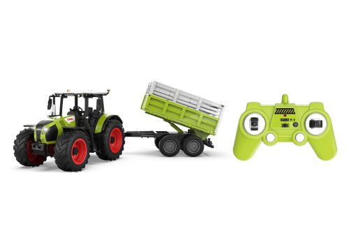 Claas Traktor s vlečkou RC na diaľkové ovládanie. Rozmery 43,6x11,4x19 cm. Frekvencia 2.4GHz. Svetelné efekty. Batériový pack 3.6V 300mAh do traktora súčasťou, 2xAA do ovládača nie sú súčasťou. USB kábel súčasťou. Prepínač ON/OFF na spodnej strane traktora a na ovládači. Tlačidlo pre svetelné efekty na ovládači. Sklopná a rozložiteľná vlečka. Sklápanie vlečky otočným mechanizmom v zadnej časti traktora. Obrázky s funkciami na zadnej a spodnej strane obalu.