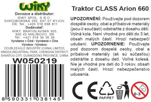 CLASS Traktor model Arion 660. Rozmery traktora 22,2x11,4x13,2cm. Mierka 1:24. Voľné kolesá. Manuálne pohyblivý hák na príves.
