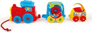 1 lokomotíva a 2 vagóniky povrázok na ťahanie za sebou ozubené kolieska skladanie veže z vagónikov rozvíja logiku a koordináciu pohybu