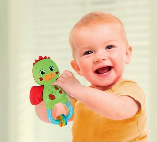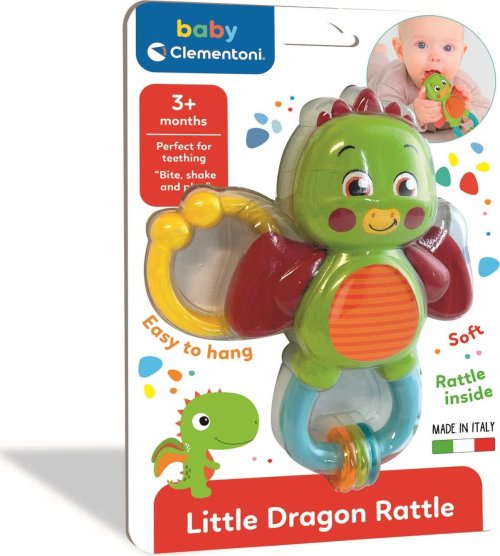 Farebná hrkálka v podobe malého dráčika s mäkkými a bezpečnými gumovými prvkami.
