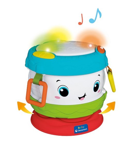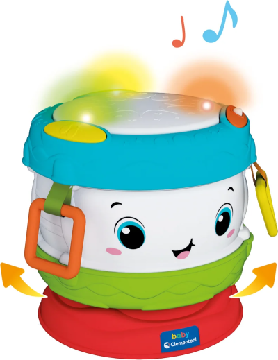 Stlačením tlačidla na ráme bubna môže dieťa počúvať veľa zábavných zvukov a melódií Rýchlosť hudby sa mení na základe rotácie bubna a vytvára svetelné a zvukové efekty Poklepaním na hornú časť bubna môže dieťa počúvať mnoho rôznych zábavných zvukov. svetelné efekty pozornosť dieťaťa a vzbudí jeho zvedavosť, keď si hrá s bubnom. Praktické rukoväte sú vyrobené z plastu a majú reliéfne detaily pre stimuláciu hmatového prieskumu.