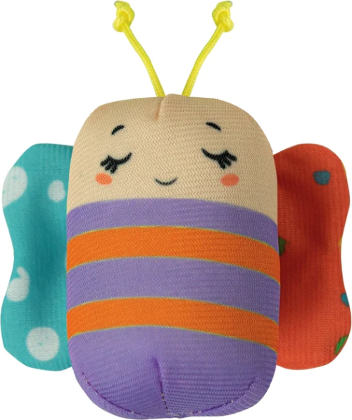 pískací motýlik so šuštiacimi krídelkami hrkajúca malá lienka rolnička vo veľkej včielke plastový mráčik a dva krúžky zvieratka sú zavesené na krásnych listoch farebné rastliny svorka na zavesenie
