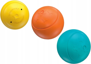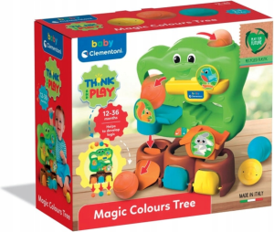 tri guličky - každá v inej veľkosti, skotúľajú sa do kmeňa a objavia sa za dvierkami rovnakej farby, rozvíja logické myslenie a koordinácia oko-ruka, pomáha trénovať jemnú motoriku (uchopiť guličku, otvoriť dvierka).