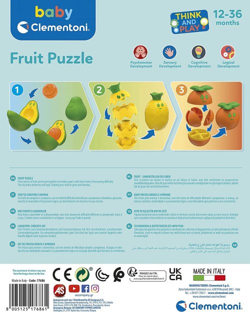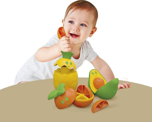 Rozmery: ananás: 8 x 8 x 13 cm, avokádo 8 x 8 x 9 cm, pomaranč 7,5 x 7,5 x 8 cm. Výrobok patrí do ekologického programu CLEMENTONI Play for Future, ktorý bol vytvorený s cieľom oznámiť deťom dôležitosť udržateľnosti a ochrany životného prostredia. Značka BABY CLEMENTONI je synonymom kreativity, nadšenia a dôrazu na kvalitu. Hračky pomáhajú rodičom pri komunikácii s dieťaťom. Vzhľad hračky a jej inovatívne farby, netoxické a pevné materiály, vytvarovaný povrch a rôzne funkcie pomáhajú pri rozvoji hmatových a sluchových schopností, napomáhajú pohybovej aktivite a vyvolávajú prvé logické asociácie.