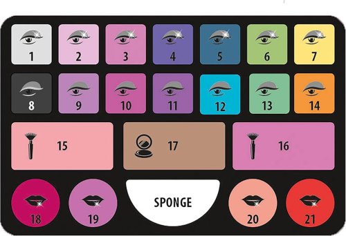 Obsah balenia: Podstavec (26x21x6cm) pre odkladanie make-upu, štetce, aplikátory, stojan na karty a mobil, paleta na make-up so 14 očnými tieňmi, 2 lícenky, púder, 4 lesky na pery, hubka, štetec, aplikátory, LED svetlo na selfíčka s trojnohou základňou (na zostavenie), Make-up kartičky s tipmi a technikami, samolepka, príručka. Na prevádzku výrobku je potrebné 3ks 1,5V batérie AAA (nie je súčasťou balenia).