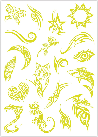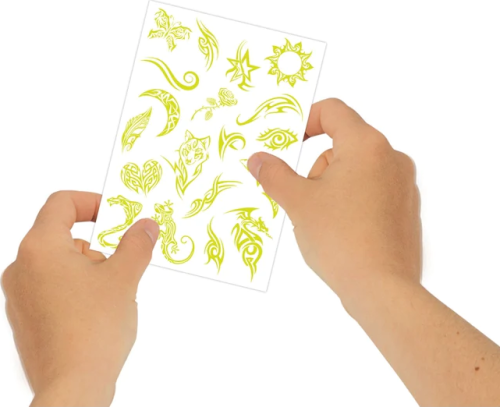Tetovacie šialenstvo ešte nikdy nebolo také úžasné. S tetovaním svietiacim v tme už Vás nikto neprehliadne. Jednoducho vystrihnite svoje obľúbené tetovanie, priložte ho na kožu, navlhčite hubkou a je hotovo. POZNÁMKA: Tetovanie je dermatologicky testované.