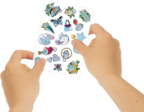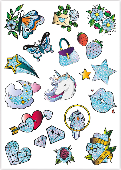 Neodolateľné trblietavé tetovanie pre štýl so super elegantným nádychom. Jednoducho vystrihnite svoje obľúbené tetovanie, priložte ho na kožu, navlhčite hubkou a je hotovo! POZNÁMKA: Tetovanie je dermatologicky testované.