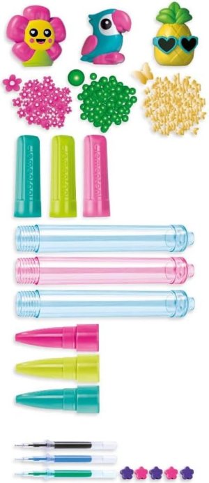 Obsah sady: Plastový stojan a lievik, 3 priehľadné tubičky na perá, 3 zátky, 3 viečka s koncovkami, 3 atramentové náplne v 3 farbách, 3 vrecká s ozdobami rôznych tvarov a farieb, 8 plastových korálikov, elastická šnúrka, 3 gumové postavy