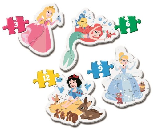 Štyri veľké puzzle pre najmenšie deti s obľúbenými Disney princeznami s počtom 3, 6, 9 a 12 dielikov. Veľké dieliky s hrúbkou 3mm sú pre malé detské ručičky ľahko uchopiteľné a prvé skladanie rozvíja manuálnu zručnosť, koordináciu aj priestorovú orientáciu. Pre deti od 2 rokov.