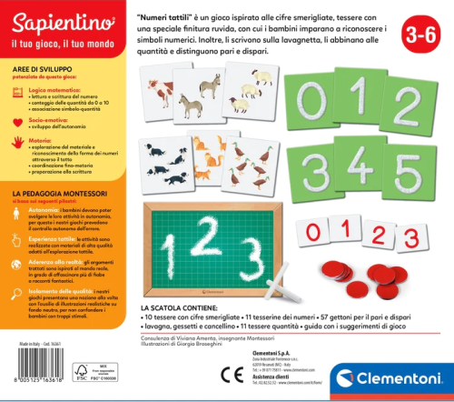 Obsahuje 10 matných doštičiek s číslami, tj so špeciálnym drsným povrchom, ktorých sa dá dotýkať a zapamätať si ich tvar. Hra stimuluje logické myslenie priraďovaním čísel k doštičkám s množstvom ak párnym a nepárnym žetónom. Dieťa sa najskôr učí rozpoznávať tvar čísel a potom si rozvíja asociačné zručnosti priraďovaním čísel k žetónom a doštičkám.