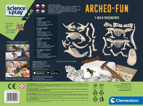 Pri objavovaní postupujte podľa návodu, v texte sa dočítate viac o fosíliách, ich vzniku ao pravekých jašteroch, kostra - fosília z fluorescenčného materiálu absorbuje denné svetlo a potom v tme svieti. Archeo sada pomáha rozvíjať zručnosť, tvorivosť, fantáziu a podporuje záujem o vedné odbory. Na stiahnutie je aplikácia Legendary Creatures v ktorej môžete svojho dinosaura rozpohybovať.