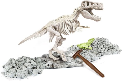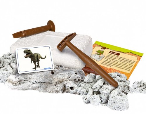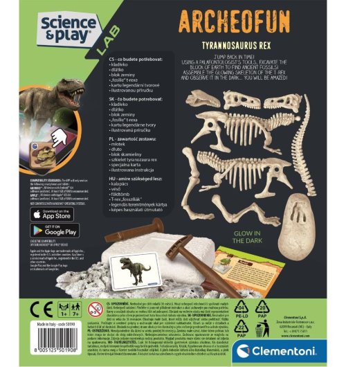 Archeologická sada z kolekcie Science & Play LAB dáva deťom príležitosť stať sa paleontológom a preskúmať kostru Tyrannosauruse Rexa. Pomocou priložených nástrojov opracujte kameň a objavte kosti, z ktorých si poskladáte svietiacu kostru T-Rexa. Pri objavovaní postupujte podľa návodu. Kostra je vyrobená z fluorescenčného materiálu, ktorý v tme svieti. Súprava pomáha rozvíjať zručnosť, tvorivosť, fantáziu a podporuje záujem o vedné odbory. Sada obsahuje: kladivko, dlátko, blok zeminy s fosíliou T-Rexa, ilustrovaný návod v češtine. Jazykové mutácie: SK, SK, PL, HU. Rozmery balenia: 25,2 x 21 x 6,5 cm. Vek: 7+