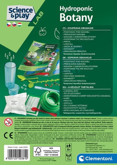 Clementoni Science&Play Hydroponická botanika. Sada so špeciálnym kvetináčom, v ktorom rastú semienka rastlín a kvetov, sa postará o dokonalý vývoj a výživu koreňov. Hydroponické kvetináče predstavujú inovatívne a efektívne riešenie na pestovanie rastlín bez použitia pôdy. Využívajú špeciálne vodné roztoky so živinami, čo zaisťuje optimálne podmienky pre rast a zdravie rastlín. Sada hydroponickej botaniky zoznámi deti s touto metódou pestovania. Balenie obsahuje podstavec pod nádobu, priehľadnú nádobu, nádobu s drenážnymi otvormi, podpornú tyč pre rastliny, pipetu, lopatku, vrecká so semienkami, keramzit a obrázkovú príručku. Rozsiahla ilustrovaná príručka obsahuje všetky informácie potrebné na to, aby vaše dieťa mohlo objaviť túto novú metódu pestovania rastlín. Jazyková mutácia CZ, SK, HU. Rozmer balenia: 21,2 x 15,2 x 5,8 cm. Vek 6+