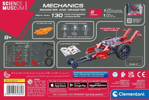 Zábavná stavebnica z kolekcie CLEMENTONI Science+amp;Play Mechanické laboratórium, z ktorého si môžete postaviť Roadster alebo Dragster.