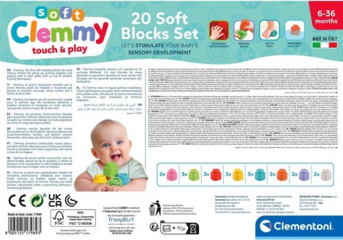 Bezpečné hranie s mäkkými farebnými kockami pre deti už od 6 mesiacov! Vďaka CLEMMY kockám môže dieťa stavať svoje prvé komíny a stavby. Hra s kockami rozvíja senzorické vnímanie, manuálnu zručnosť a priestorové vnímanie. Hra so stavebnými kockami podnecuje fantáziu a deti sa zabavia na dlhé hodiny. Balenie obsahuje: 20 mäkkých farebných kociek. POZNÁMKA: Mäkké kocky je možné umývať neutrálnym mydlom pri max teplote 30°C. Značka BABY CLEMENTONI je synonymom kreativity, nadšenia a dôrazu na kvalitu. Hračky pomáhajú rodičom pri komunikácii s dieťaťom. Vzhľad hračky a jej inovatívne farby, netoxické a pevné materiály, vytvarovaný povrch a rôzne funkcie pomáhajú pri rozvoji hmatových a sluchových schopností, napomáhajú pohybovej aktivite a vyvolávajú prvé logické asociácie. Z výrobkov firmy sú na slovenskom trhu obľúbené najmä CLEMMY kocky, ktoré sú vyrobené z mäkkej netoxickej gumy. Tá je zároveň ľahko umývateľná a má ľahkú vanilkovú vôňu.