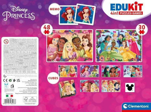 EDUkit 4v1 - súbor hier (puzzle 30 dielikov, puzzle 48 dielikov, 6 plastových kociek a pexeso). Puzzle je s rovnakým rozmerom 24 x 17 cm, ale s rôznym počtom dielikov, preto sa s vyšším počtom dielikov zmenšuje ich veľkosť. Balené v kartónovej krabici s plastovým uchom pre ľahké prenášanie. Rozmer zloženého puzzle cca 24 x 17 cm