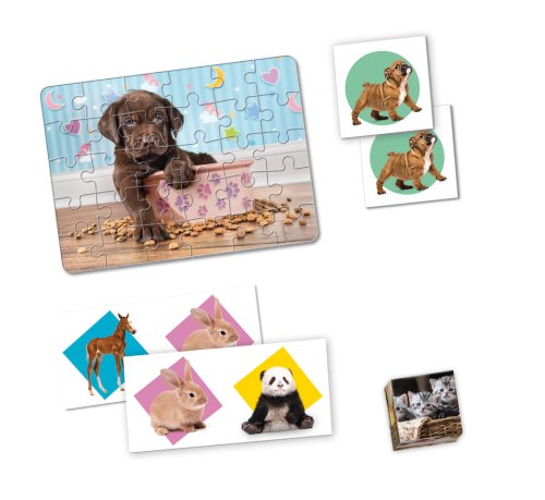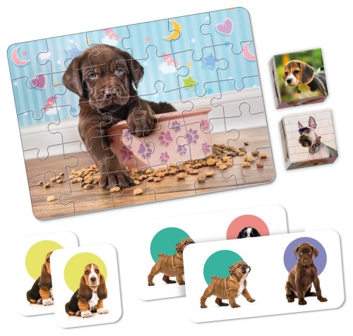 EDUkit 4v1 - súbor hier (puzzle s 30 dielikmi, 6 plastových kociek, hry pexeso a domino). Herná sada s roztomilými obrázkami šteniatok Vám prinesie množstvo hodín zábavy! Zahrajte sa so svojimi deťmi pexeso, domino, skladajte puzzle alebo obrázky z kociek. Balené v kartónovej krabici s plastovým uchom pre ľahké prenášanie. Rozmer zloženého puzzle cca 33 x 24 cm