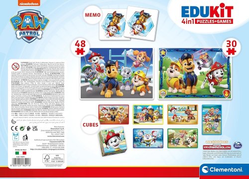 EDUkit 4v1 - súbor hier (puzzle 30 dielikov, puzzle 48 dielikov, 6 plastových kociek a pexeso). Puzzle je s rovnakým rozmerom 24 x 17 cm, ale s rôznym počtom dielikov, preto sa s vyšším počtom dielikov zmenšuje ich veľkosť. Balené v kartónovej krabici s plastovým uchom pre ľahké prenášanie. Rozmer zloženého puzzle cca 24 x 17 cm